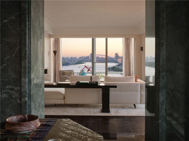 步入室内,客厅以外部景观为根本发展行为和应对居住者的情绪。设计则以“退隐”的姿态,将空间“还给”最昂贵的资源——那一扇窗,以及窗外无法复刻的一线江景。