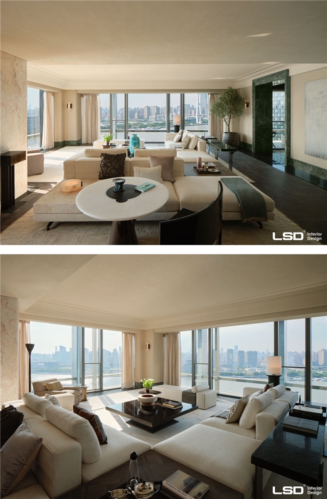 其二,得益于户型中的360°玻璃幕墙与直面黄浦江一线的江景,让空间可以最大限度的引入自然光线,并成为塑造氛围和情绪的主角。因此,团队在所有能看到外部景观的立面上都不做装饰性的雕琢,以偏建筑语言的手法去构建。