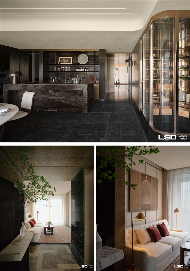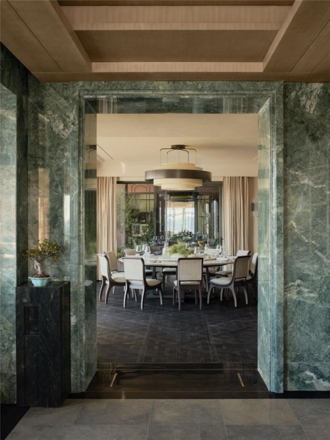 其一,设计剥离传统豪宅追求繁复装饰与强调空间分隔的构成手法,而是回归空间的本源,即:“人如何在其中生活”。以抽离设计师的“第三者”视角观看空间整体,通过“模糊空间边界”的大块面处理,建立一种内在的、宁静的秩序感。