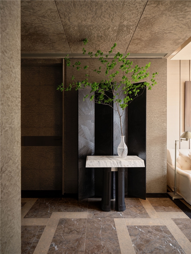 电梯厅是内部空间的核心动线,由两端的入户门分别可以进入客厅与餐厅。设计通过玄关地面以及墙面材质的拉通,弱化电梯的存在感,将电梯厅私属化,模糊了公共空间和家庭私人空间的边界。而这种由动线优化生成的“自由感”则进一步强化了边界上的模糊,让电梯厅得以转变为“家庭走廊”的存在。