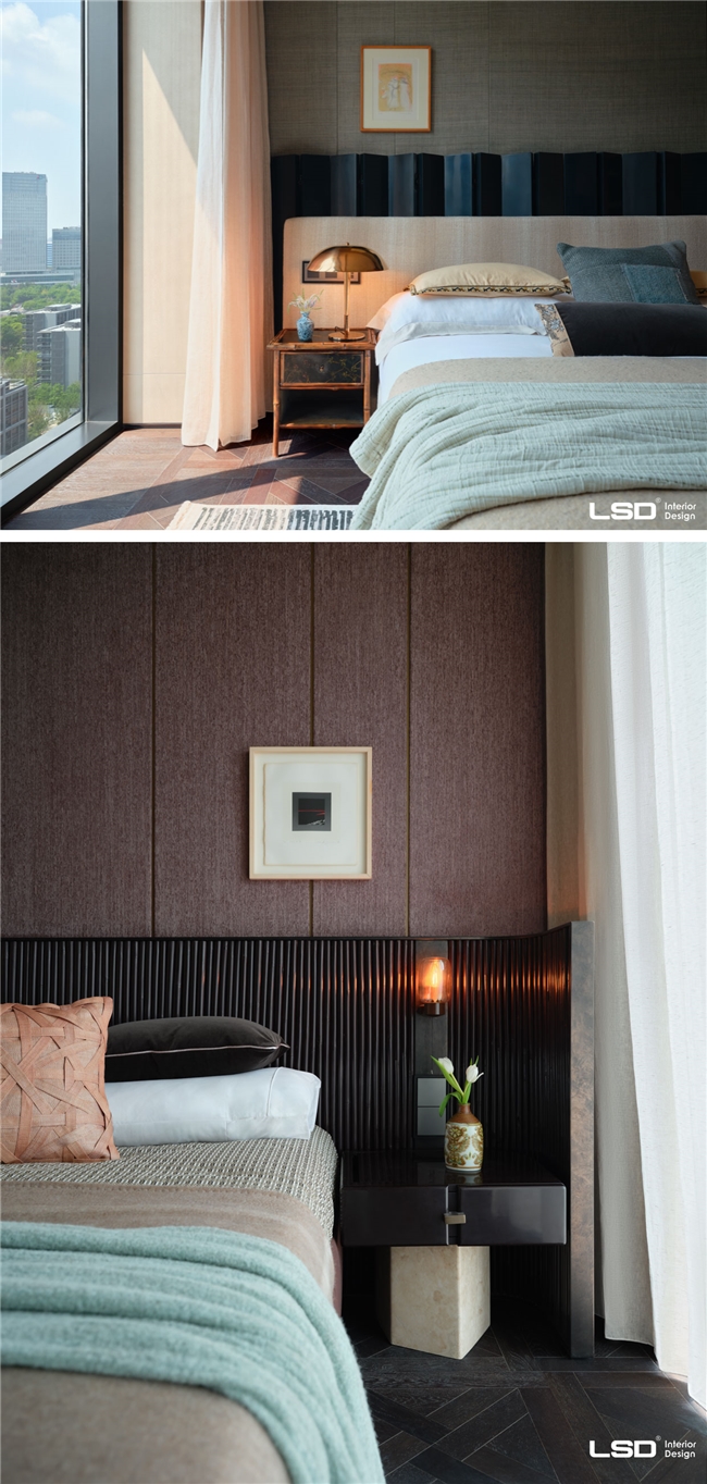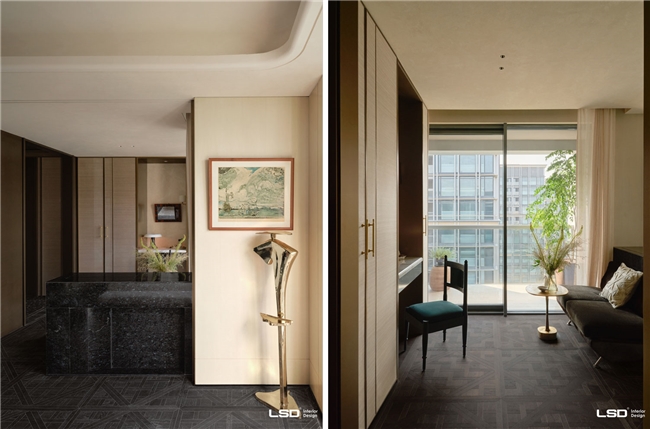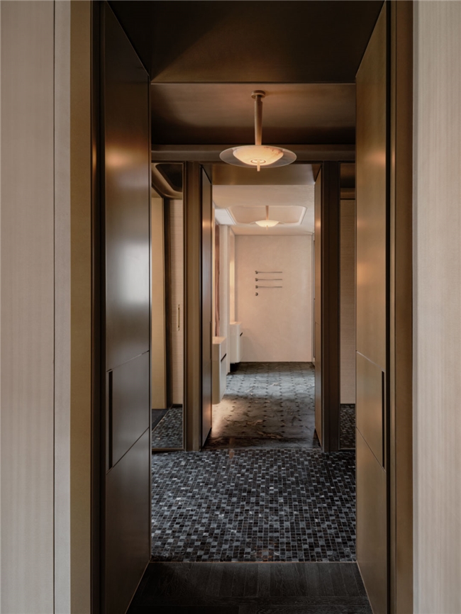 主卫、衣帽间与卧室主体的地板均使用不同材质和拼花手法,以此强调不同功能区域的生活形态转化。