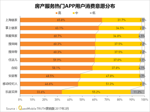 接下来看看房产服务热门APP用户规模和粘性。QuestMobile数据显示,从2016年2月到2017年2月,安居客与搜房网互有高低,基本上维持一二位,掌上链家,这个是此前Mr.QM介绍过的,从线下杀到线上的“实力派”,加上前几年线下与线上的几次狙击战,市场格局颇值得玩味。